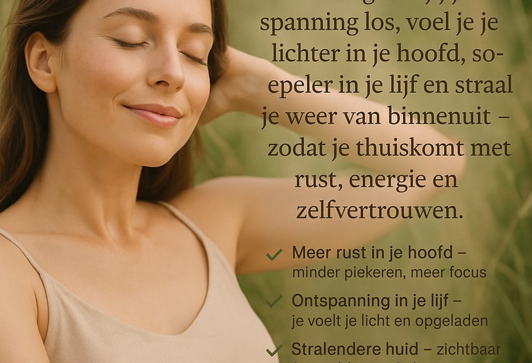 In 4 maanden verandert dat fundamenteel: je lijf ontspant, je zenuwstelsel kalmeert, angst en zelftwijfel nemen af en je energie stijgt. Je voelt je weer jezelf, maar krachtiger. Zachter. Aantrekkelijker.
